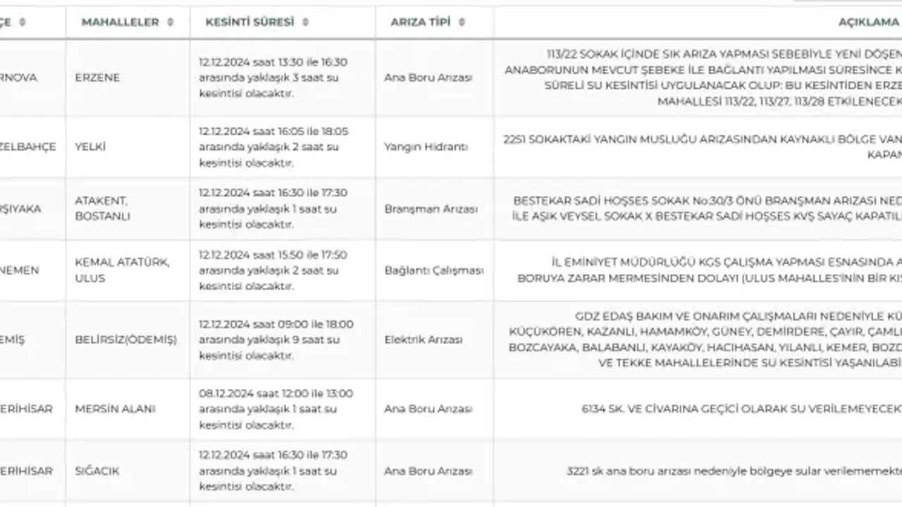 Bu ilçelerde su kesintileri, belirli saat aralıklarında etkili olacak. Kesintilerin ne zaman sona ereceği ve suların ne zaman geleceği konusunda henüz kesin bir bilgi verilmedi. Ancak, İZSU'nun resmi açıklamalarını takip etmek, güncel bilgilere ulaşmak açısından faydalı olacaktır [1].