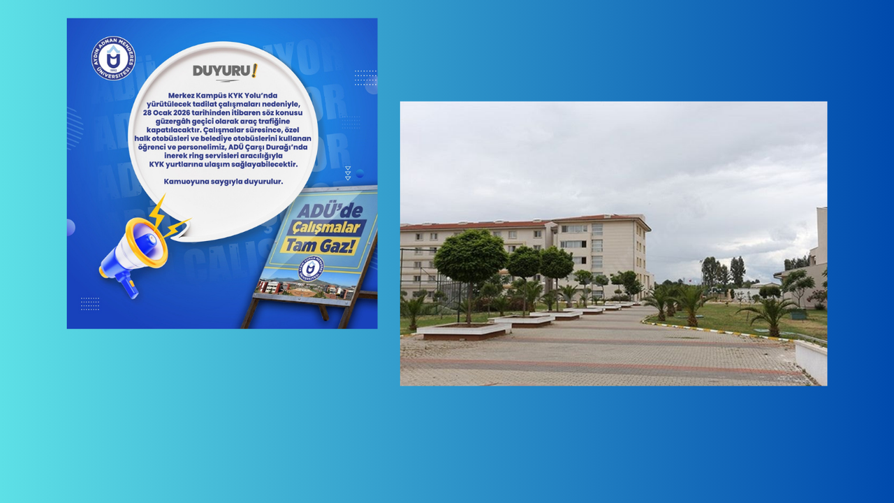 Aydın Adnan Menderes Üniversitesi içerisinde bulunan Merkez Kampüs KYK Yolu'nun geçici olarak trafiğe kapatılacağını duyurdu. Aydın Adnan Menderes Üniversitesi'nden yapılan açıklamada 'Merkez Kampüs KYK Yolu'nda yürütülecek tadilat çalışmaları nedeniyle, 28 Ocak 2026 tarihinden itibaren söz konusu güzergah geçici olarak araç trafiğine kapatılacaktır. Çalışmalar süresince, özel halk otobüsleri ve belediye otobüslerini kullanan öğrenci ve personelimiz, ADÜ Çarşı Durağı'nda inerek ring servisleri aracılığıyla KYK yurtlarına ulaşım sağlayabilecektir' ifadeleri yer aldı.