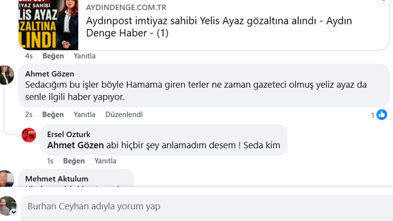 Aydınpost İmtiyaz Sahibi Yelis Ayaz’ın gözaltına alındığı haberinin altına yapılan, “Sedacığım bu işler böyle, hamama giren terler. Ne zaman gazeteci olmuş Yelis Ayaz da seninle ilgili haber yapıyor” yorumu tartışma yarattı. Ayaz’ın isimsiz yazısının ardından gelen bu yorum, “isim ifşası mı yapıldı?” sorusunu gündeme getirdi.