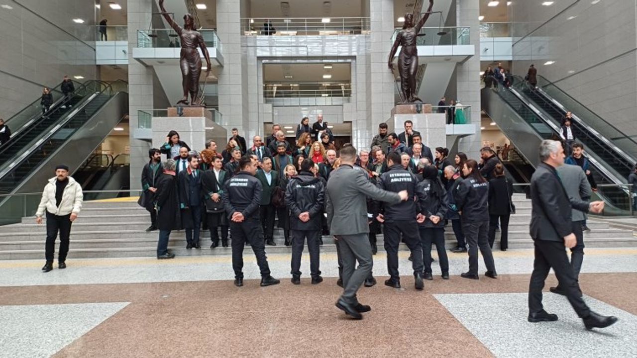 Avukatlar, adliye önüne çıkmadan önce adliyenin Atrium alanında toplandı. O sırada fotoğraf çekmek isteyen basın mensupları ile avukatlar arasına adliyenin güvenlik görevlileri girdi. Sıralı bir şekilde yan yana duran güvenlik personeli, görüntü açısına girerek basının fotoğraf çekmesine engel olmaya çalıştı.