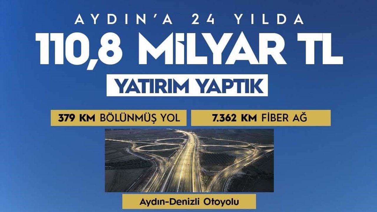 Cumhurbaşkanı Recep Tayyip Erdoğan'ın katılımıyla saat 13.30'da Aydın Atatürk Kent Meydanı'nda gerçekleştirilecek toplu açılış ve temel atma töreni öncesi kent genelinde yapılan yatırımlar ve devam eden projeler gündeme geldi. Ulaştırma ve Altyapı Bakanı Abdulkadir Uraloğlu sosyal medya hesabından yaptığı paylaşımla AK Parti iktidarında geçen 24 yıllık süre içerisinde Ulaştırma ve Altyapı Bakanlığı tarafından Aydın'a 110,8 milyar liralık yatırım yapıldığı kaydetti. Bakan Uraloğlu'nun paylaştığı bilgilere göre son 24 yılda Aydın'da bugüne kadar 379 kilometre bölünmüş yol hayata geçirilirken, 7 bin 362 kilometrelik fiber ağ altyapısı kuruldu. Ulaşım yatırımlarının önemli projelerinden biri olan Aydın-Denizli Otoyolu, bölgenin trafik yükünü azaltarak ulaşımı daha güvenli ve konforlu hale getirdi.