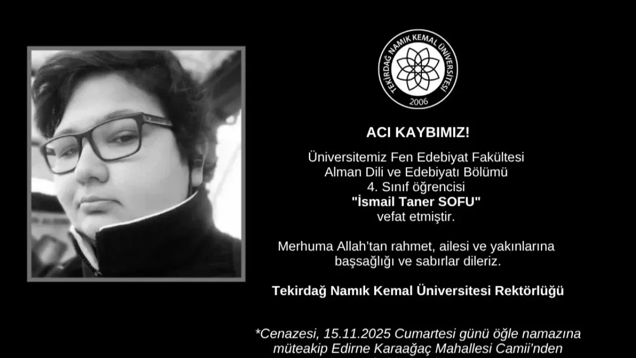 Tekirdağ Namık Kemal Üniversitesi Fen Edebiyat Fakültesi Alman Dili ve Edebiyatı Bölümü 4. sınıf öğrencisi İsmail Taner Sofu, final dönemine kısa süre kala hayatını kaybetti. Genç yaşta gelen ani vefat, üniversite camiasında ve memleketi Edirne’de derin bir üzüntüye yol açtı.