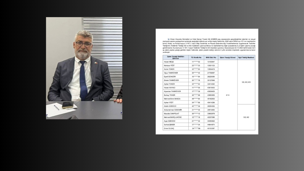 Bültende; "Ersan Alışveriş Hizmetleri ve Gıda Sanayi Ticaret AŞ (KIMMR) pay piyasasında gerçekleştirilen işlemler ve sosyal medyada yapılan paylaşımlar nedeniyle aşağıdaki tabloda yer verilen kişiler hakkında, 6362 sayılı SPKn’nun 101 inci maddesinin birinci fıkrası ve Kurulumuzun V-101.1 sayılı Bilgi Suistimali ve Piyasa Dolandırıcılığı İncelemelerinde Tedbirler Tebliği (Tebliğ) 5/2 ve 6/2 maddeleri uyarınca Borsa ve teşkilatlanmış diğer piyasalarda 2 yıl işlem yapma yasağı getirilmesine; Kurulumuzun V-101.1 sayılı Tedbirler Tebliği’nin 6/3 maddesi uyarınca, Kurulumuzun 02.10.2022 tarihli kararı ile 6 ay işlem yapma yasağı getirilen kişiler hakkında, işlem yasaklı kaldığı sürenin 2 yıllık süreden düşülerek uygulanmasına karar verilmiştir." ifadelerine yer verildi.