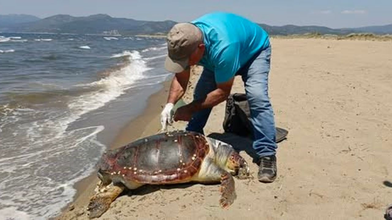 Aydın’ın Kuşadası ilçesi Pamucak Sahili’nde Caretta Caretta cinsi deniz kaplumbağası kıyıya vurmuş şekilde bulundu. EKODOSD Başkanı Bahattin Sürücü, kaplumbağanın baş kısmına aldığı darbe sonucu telef olduğunu ve büyük ihtimalle nefes almak için su yüzeyine çıktığında bir deniz aracıyla çarpıştığını belirtti.