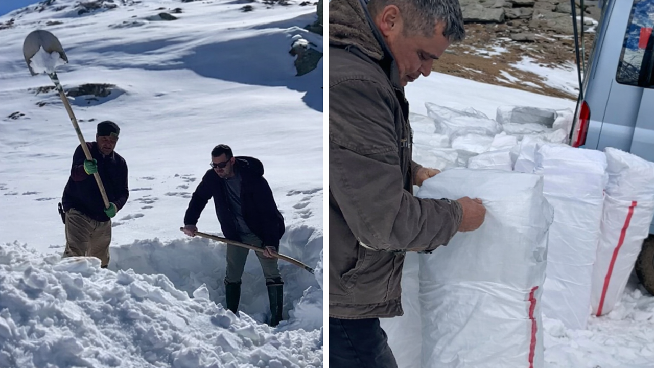 Kış aylarında yağan ve erimemesi için özel yöntemlerle toplanan karlar, buz gibi havada iş makineleri yardımıyla bir araya getiriliyor. Toplanan karlar önce çuvallara dolduruluyor, ardından metrelerce derinlikte önceden hazırlanan kuyulara özenle yerleştiriliyor. Kuyulara stoklanan karlar, yaz boyunca korunarak saklanıyor.