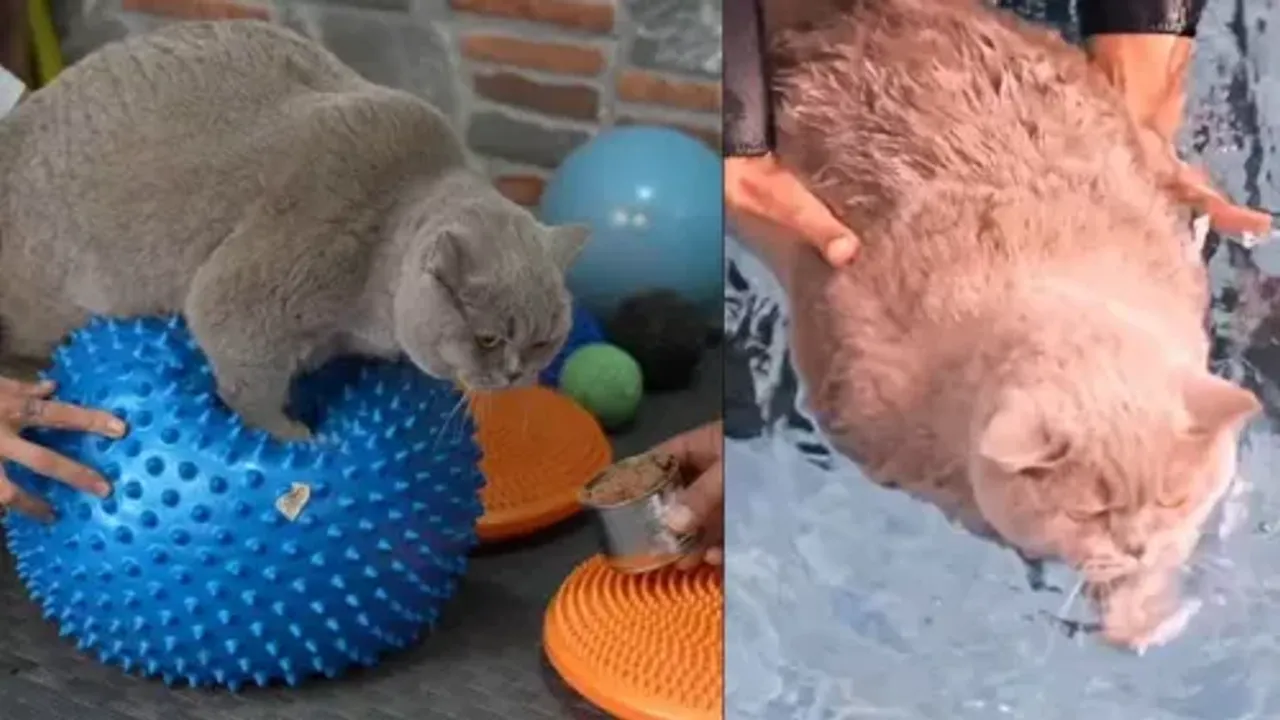 Ankara'da yaşayan obez kedi Şiraz tüm mutsuzluğuna rağmen eğitimcilerinin desteğiyle kilo vermek için havuzda yüzüyor ve pilates yapıyor. Beyza Dikkatli'nin 2,5 aylıkken sahiplendiği kedisi kısırlaştırma sonrası hızla kilo alarak 9 kiloyla 4 yaşına ulaştı.