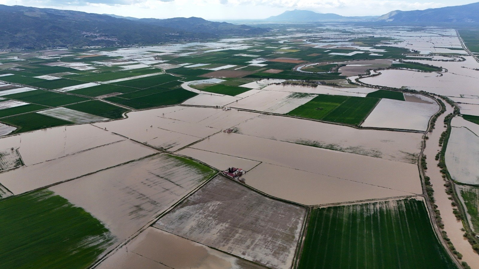 Öte yandan, taşkının boyutu dron ile havadan görüntülendi. Görüntülerde geniş tarım arazilerinin tamamen sular altında kaldığı ve suyun yerleşim yerlerine kadar yaklaştığı görüldü. Yaşanan taşkın, bölgedeki çiftçilerin ürünlerinde ciddi zarara yol açtı.
