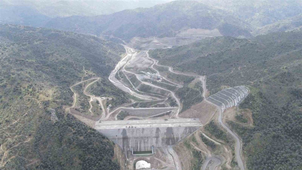 Aydın’ın Söke ilçesinde yapılan ve bittiğinde 66 milyon metreküp su depolama hacmine sahip olacak Sarıçay Barajı’nda çalışmalar sürüyor.